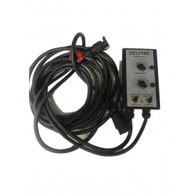 Caja de control de plástico negro con 2 interruptores de siembra / ventilación y una luz indicadora, además de un regulador de flujo graduado de 0 a 30.