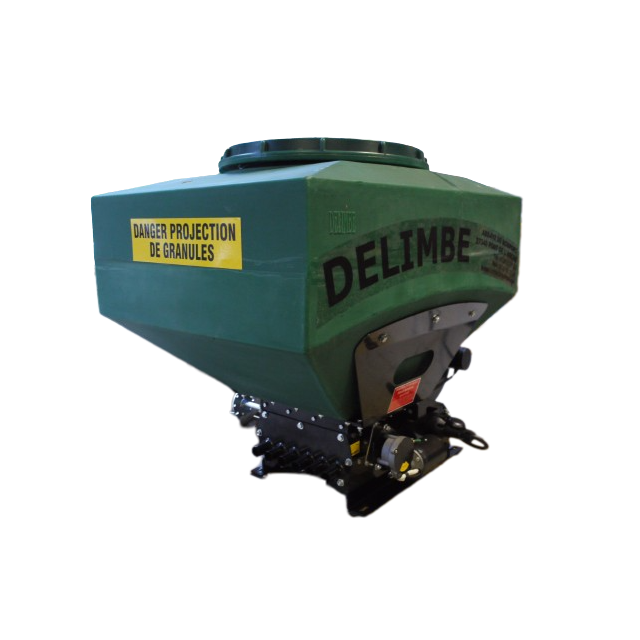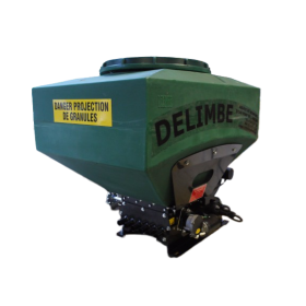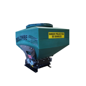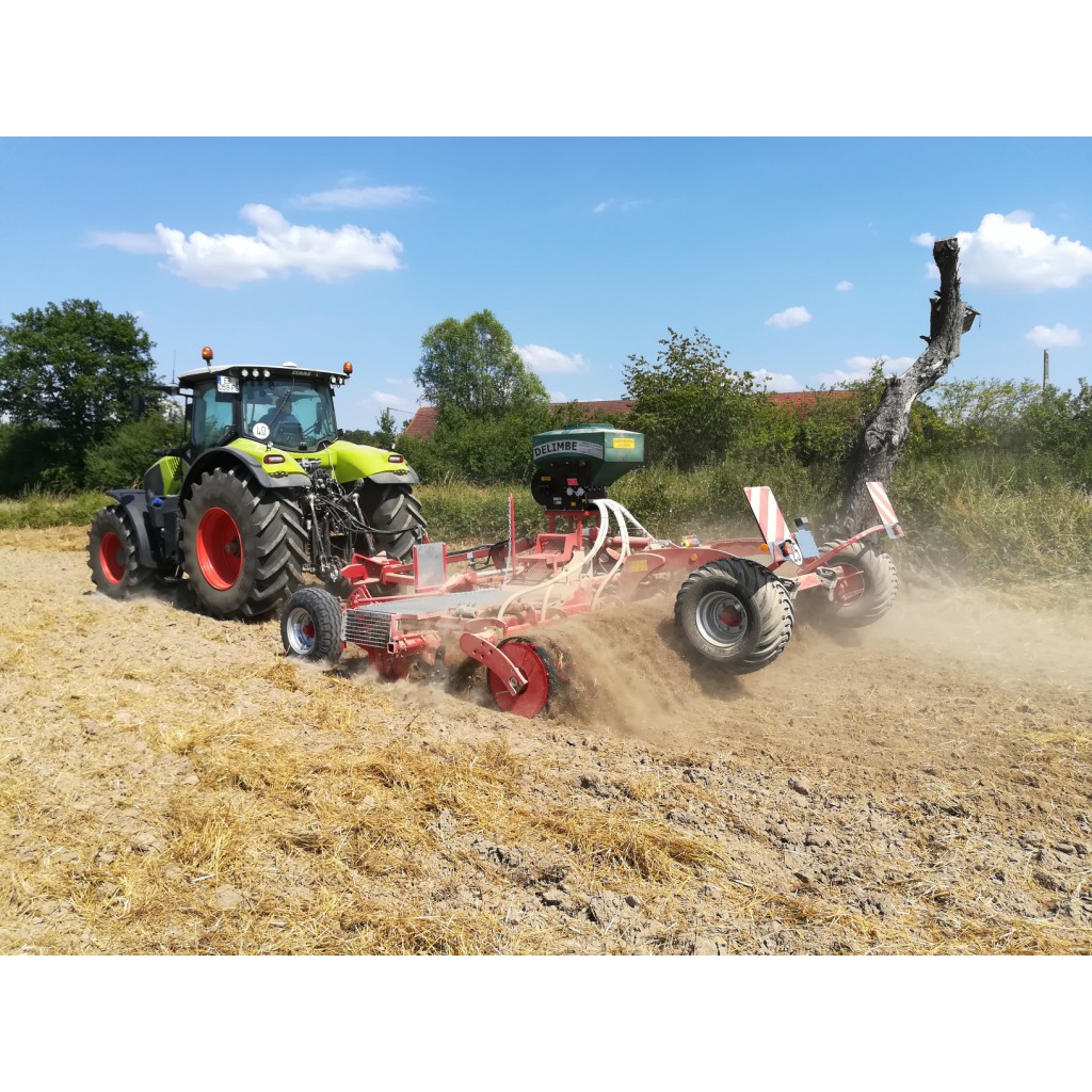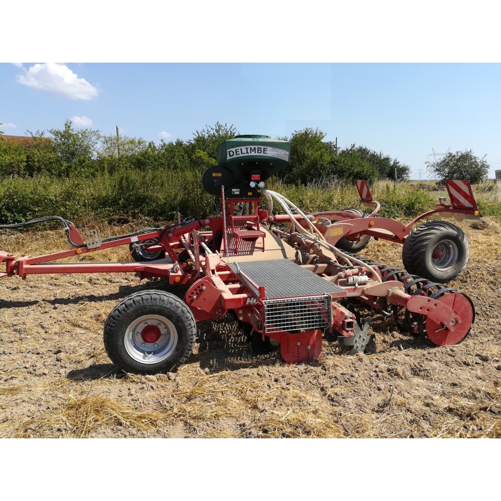 Sur une herse étrille : L’appareil permet de régénérer les prairies au printemps. On peut monter le semoir pneumatique Delimbe T18 à soufflerie sur herse-étrille, déchaumeur, coupe de moissonneuse-batteuse ou n'importe quel appareil de travail du sol.