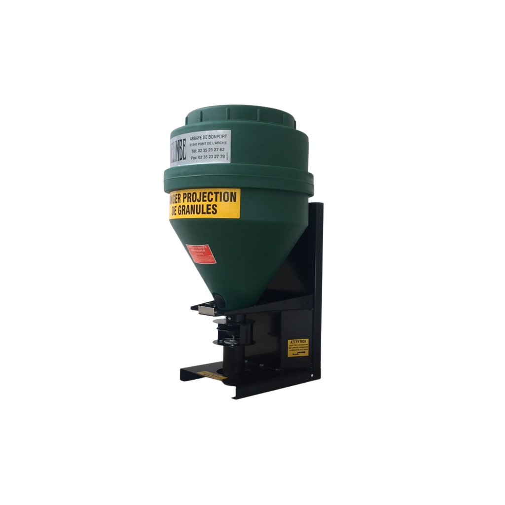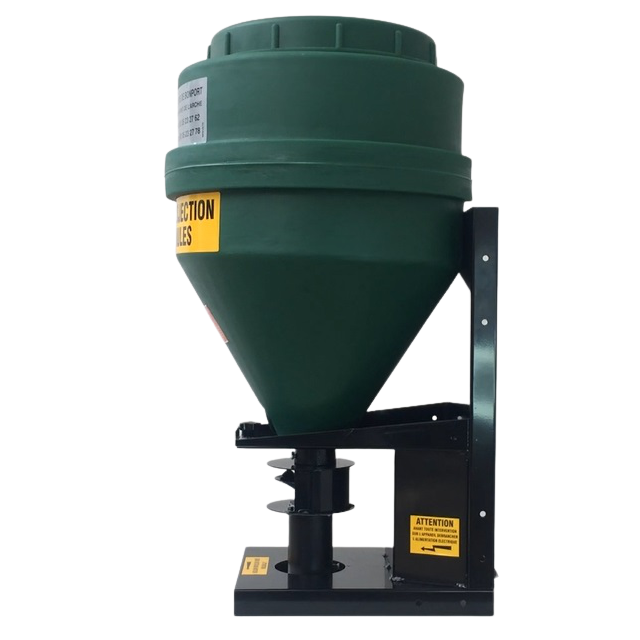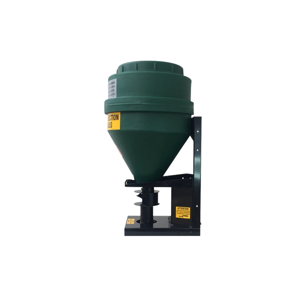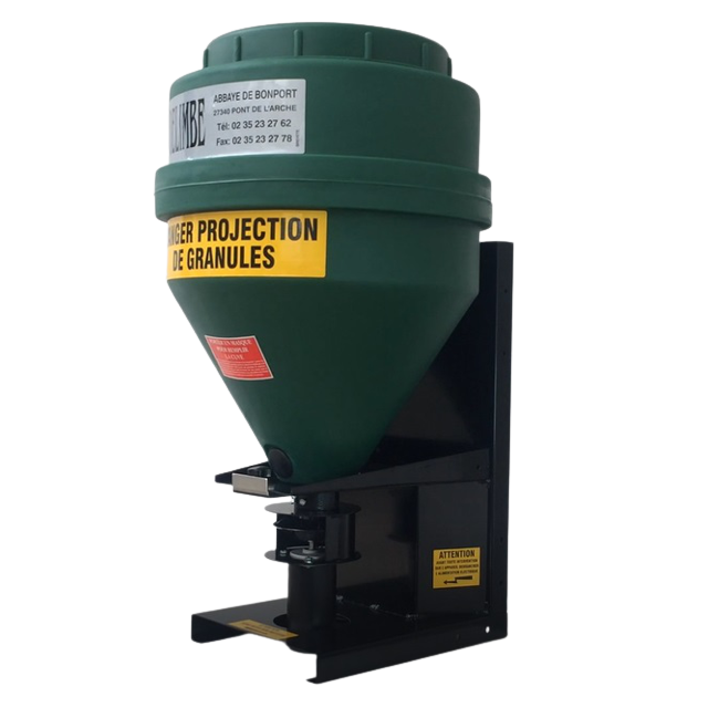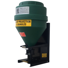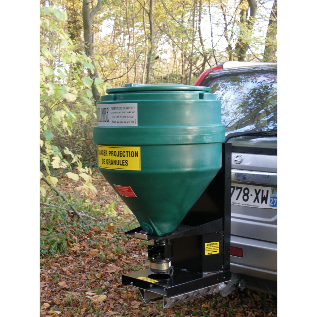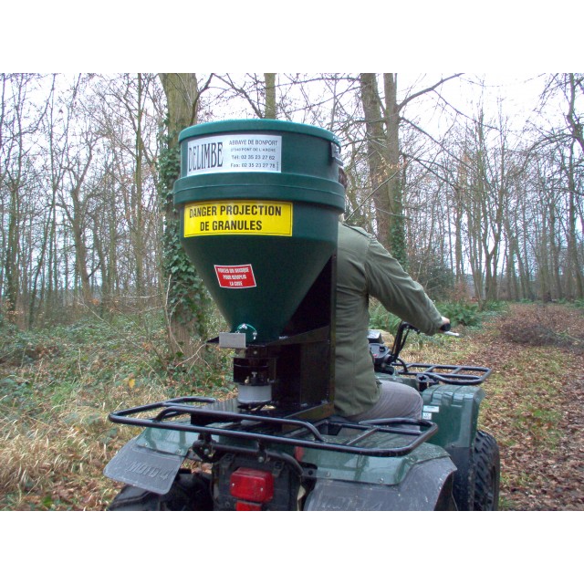 Distributeur de grains et céréales spécialement conçu pour nourrir le gibier, disponible en 70 et 120 litres. Il permet d'épandre du maïs, blé, pois ou d'autres céréales à un débit de 0 à 50 kg/minute. Il se monte sur quad directement ou tout autre véhicule tout terrain.