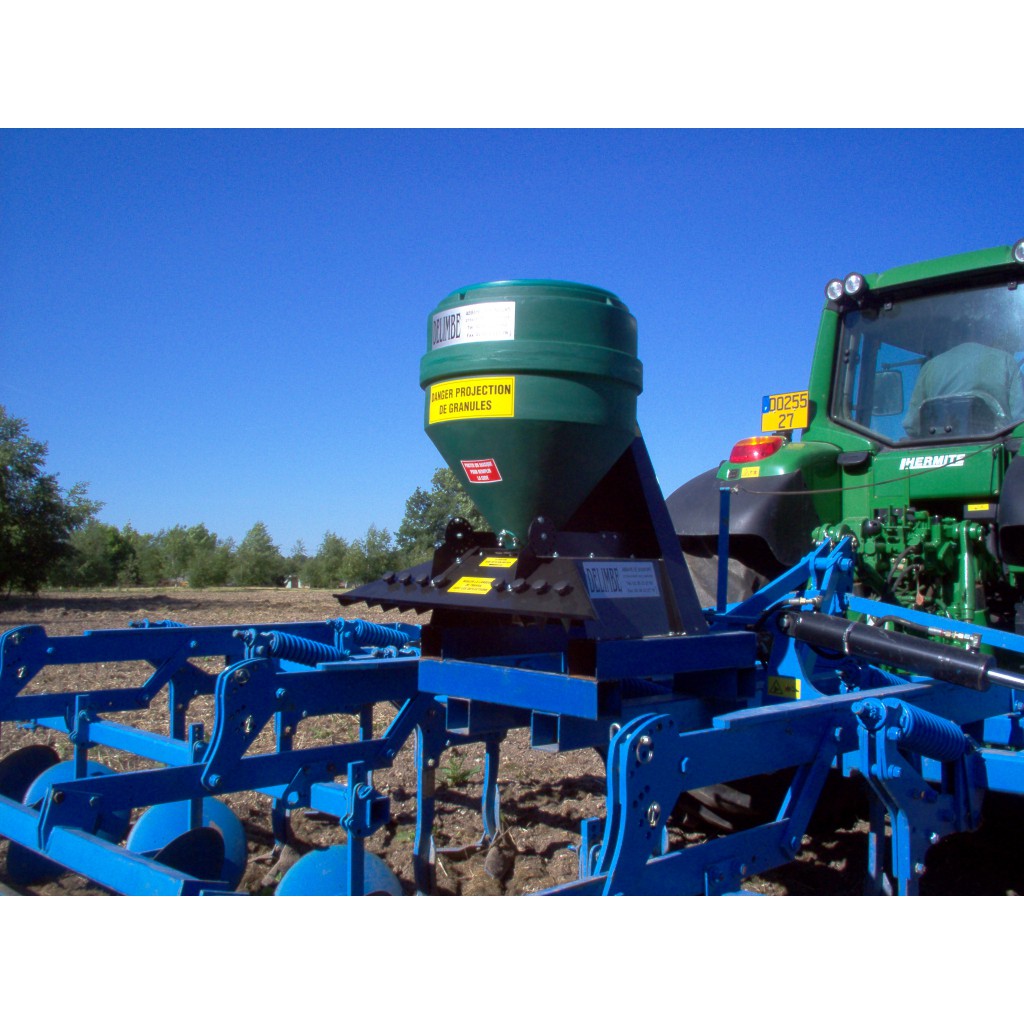 - Il se place sur le déchaumeur et projette très près derrière l'outil de travail du sol et avant le rouleau, réglage de la largeur de travail de 2,5 à 5 mètres.